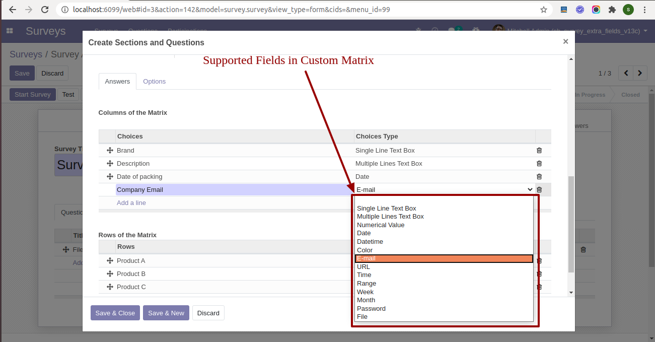 The custom matrix in the survey form.