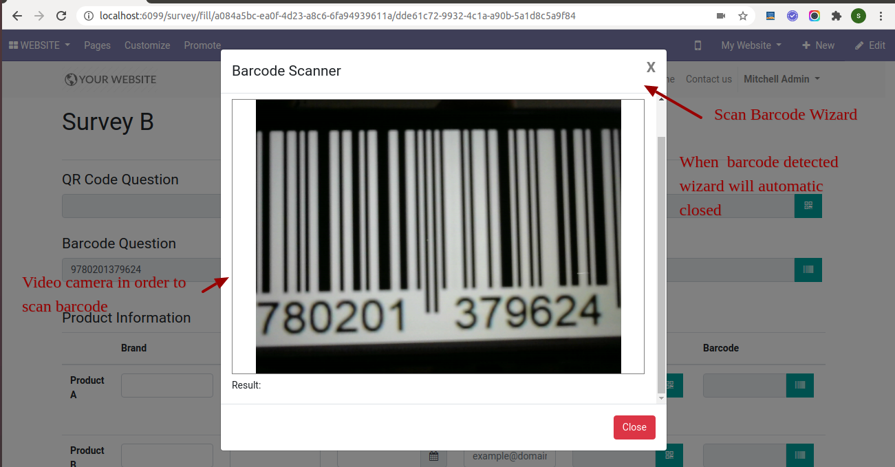 Scan Barcode from wizard after successfully scanning it will automatically close that.