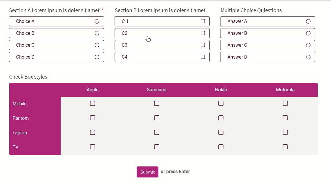 You can customize your Questions and Answers like bootstrap grid system. This feature will help to display your survey form more clean and attractive.