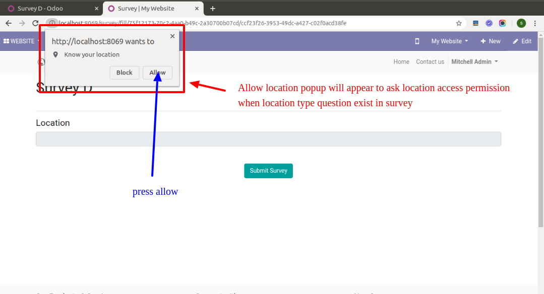 Press "Allow" in the popup to access permission in the location type survey.