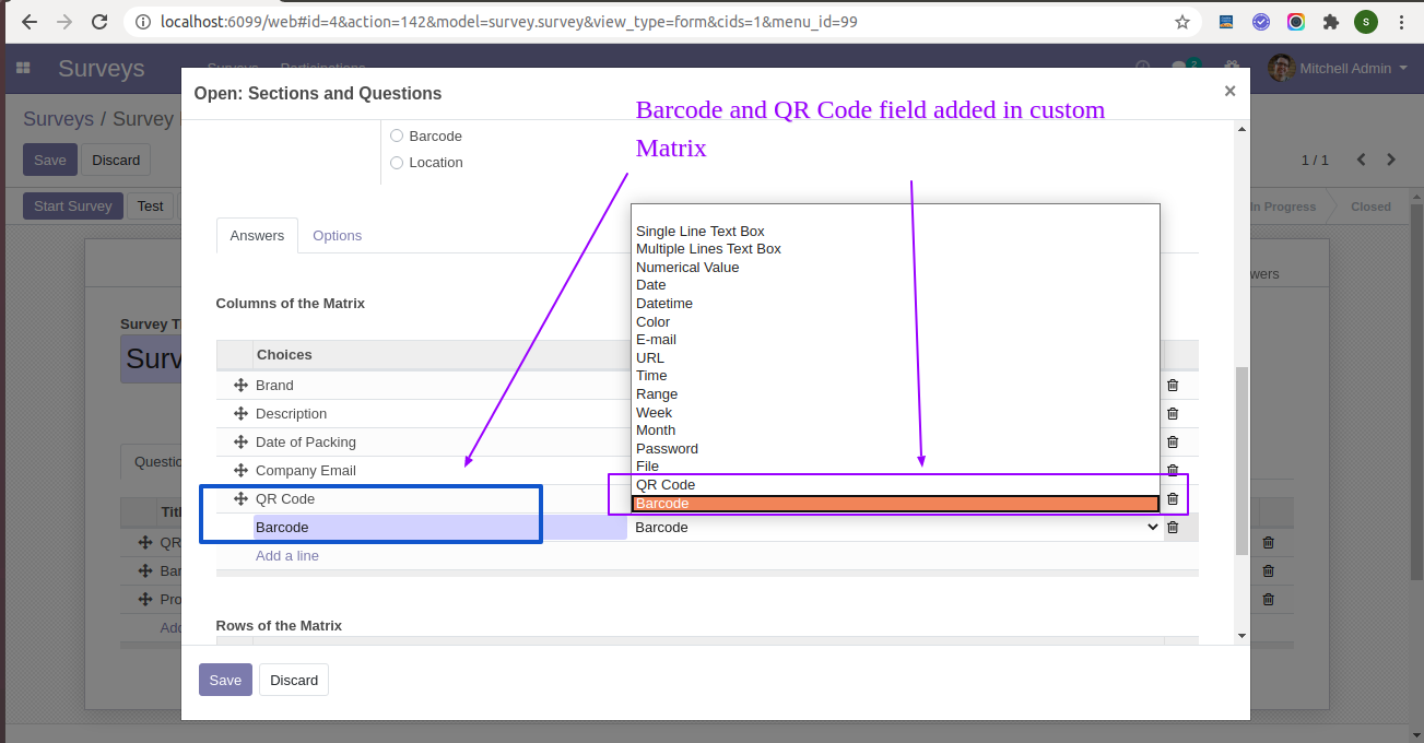 Barcode/QRCode fields added in the matrix.
