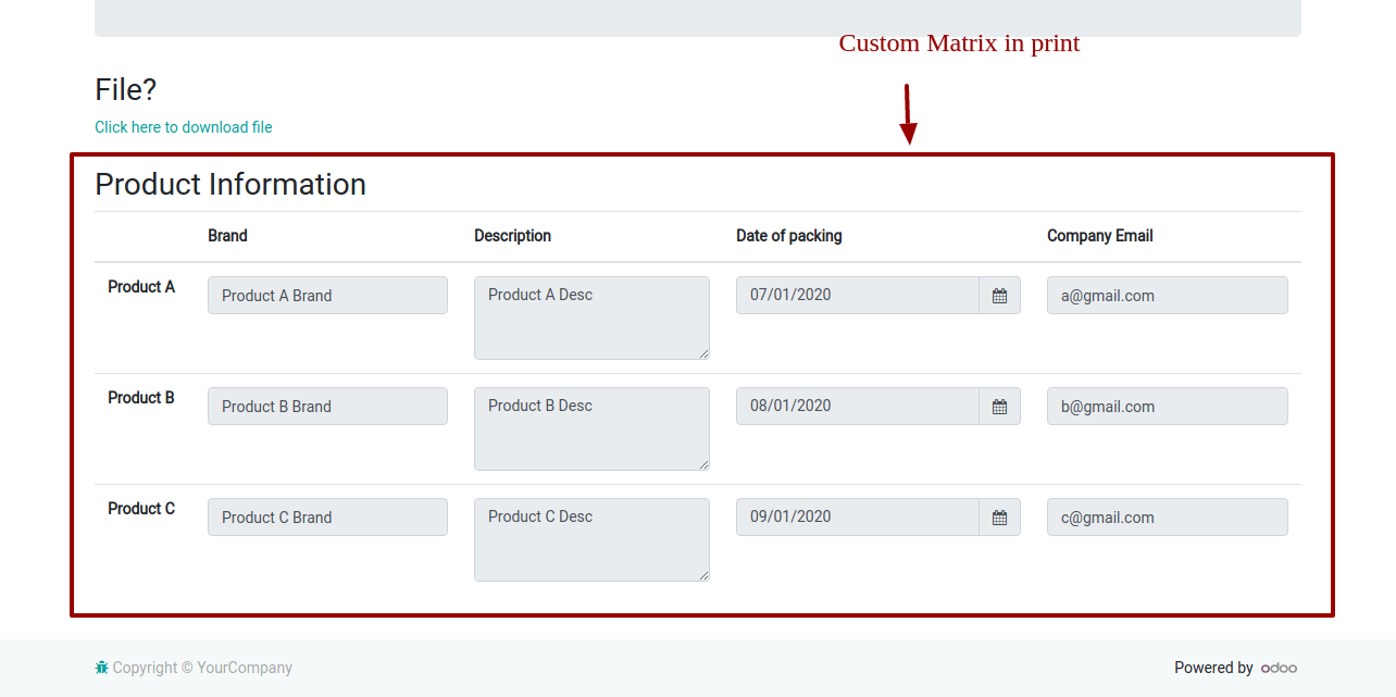 Barcode/QRCode fields added in the matrix.