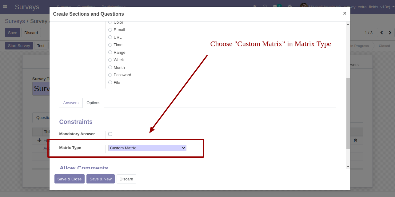 The custom matrix in the survey form.