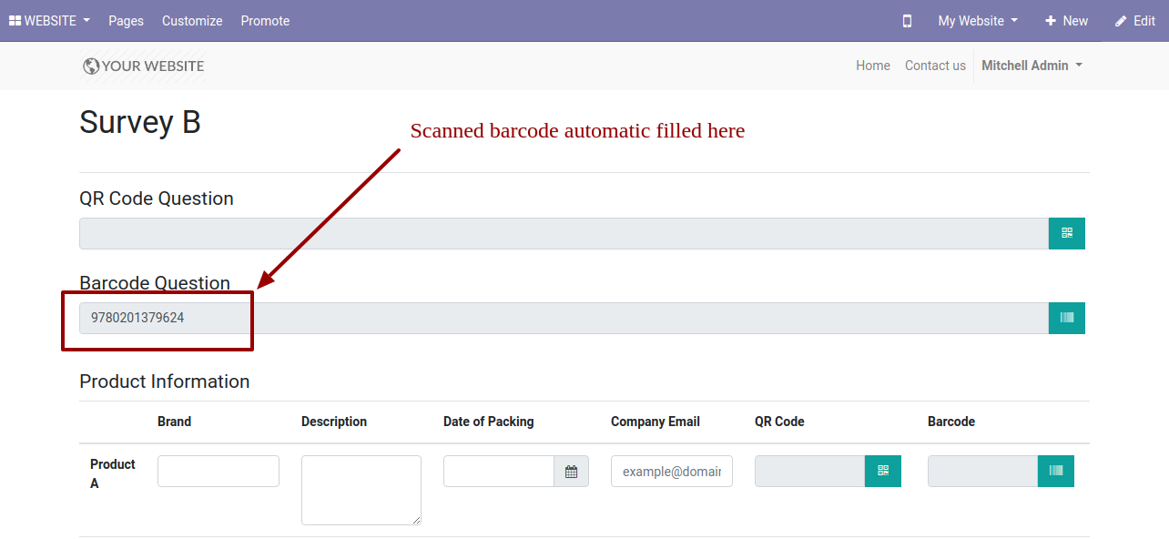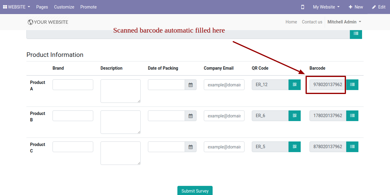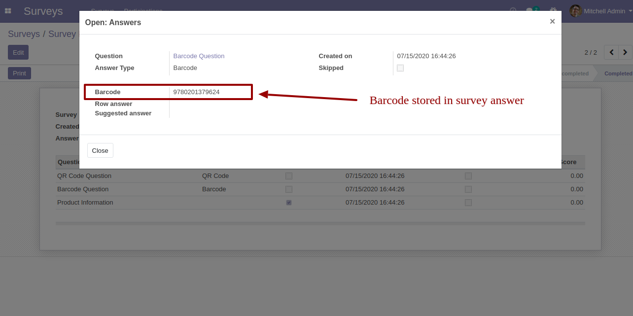 After press "Submit Survey" it stores Barcode in the survey, Barcode Field in backed looks like below.