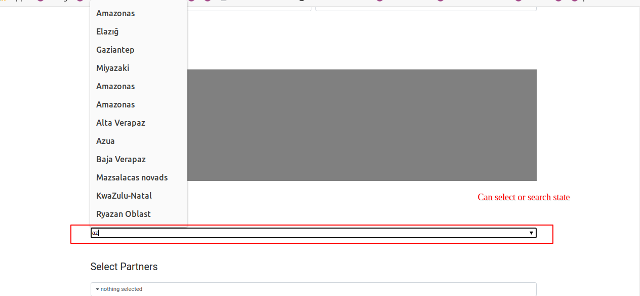 Using Many2one field you can select and search state in survey.