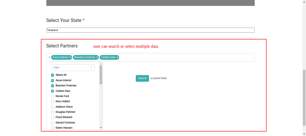 Using Many2many field you can select and search partners in survey.