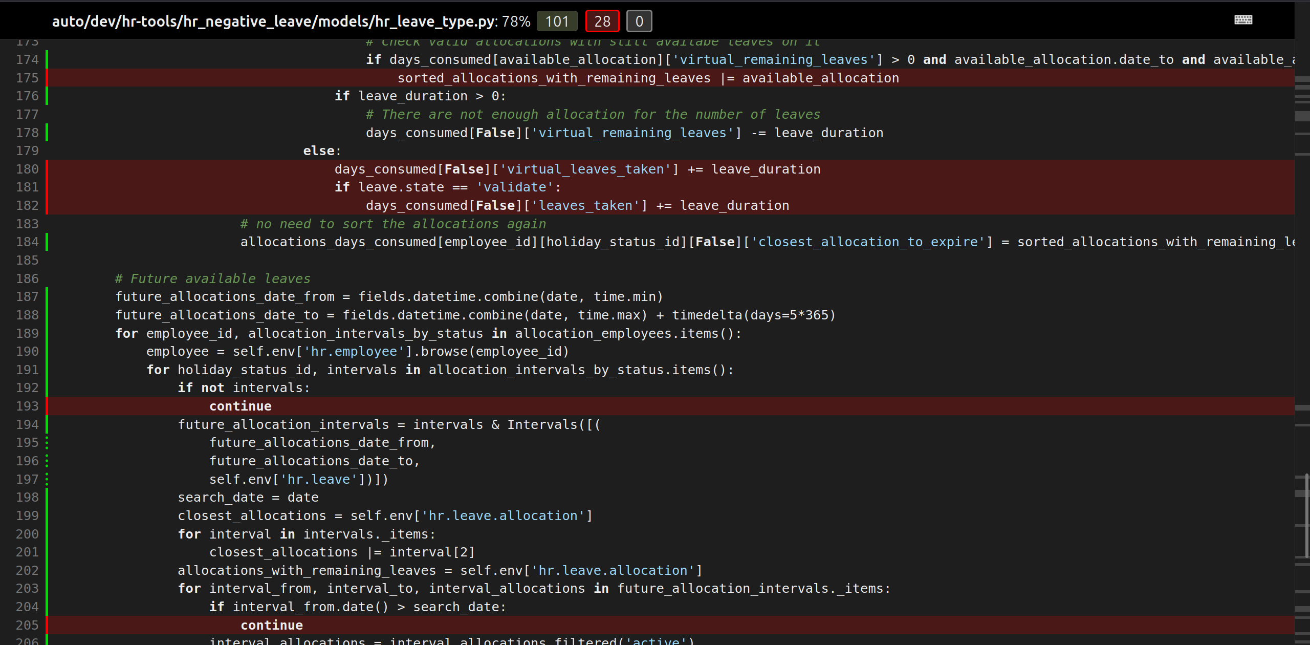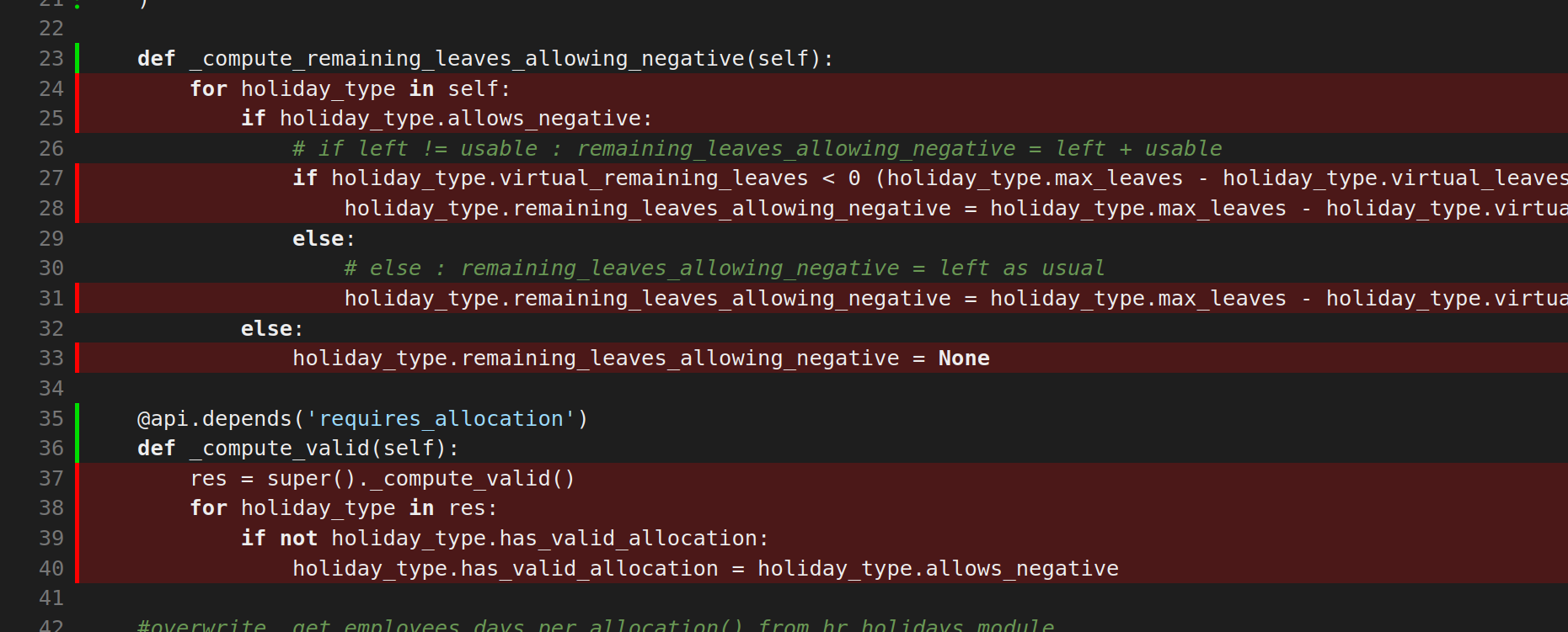 hr_holidayspassent :)@@ -0,0 +24,4 @@for holiday_type in self:if holiday_type.allows_negative:# if left != usable : remaining_leaves_allowing_negative = left + usableif holiday_type.virtual_remaining_leaves < 0 (holiday_type.max_leaves - holiday_type.virtual_leaves_taken) != holiday_type.virtual_remaining_leaves:Tu peux ajouter des tests pour ce compute please ?
