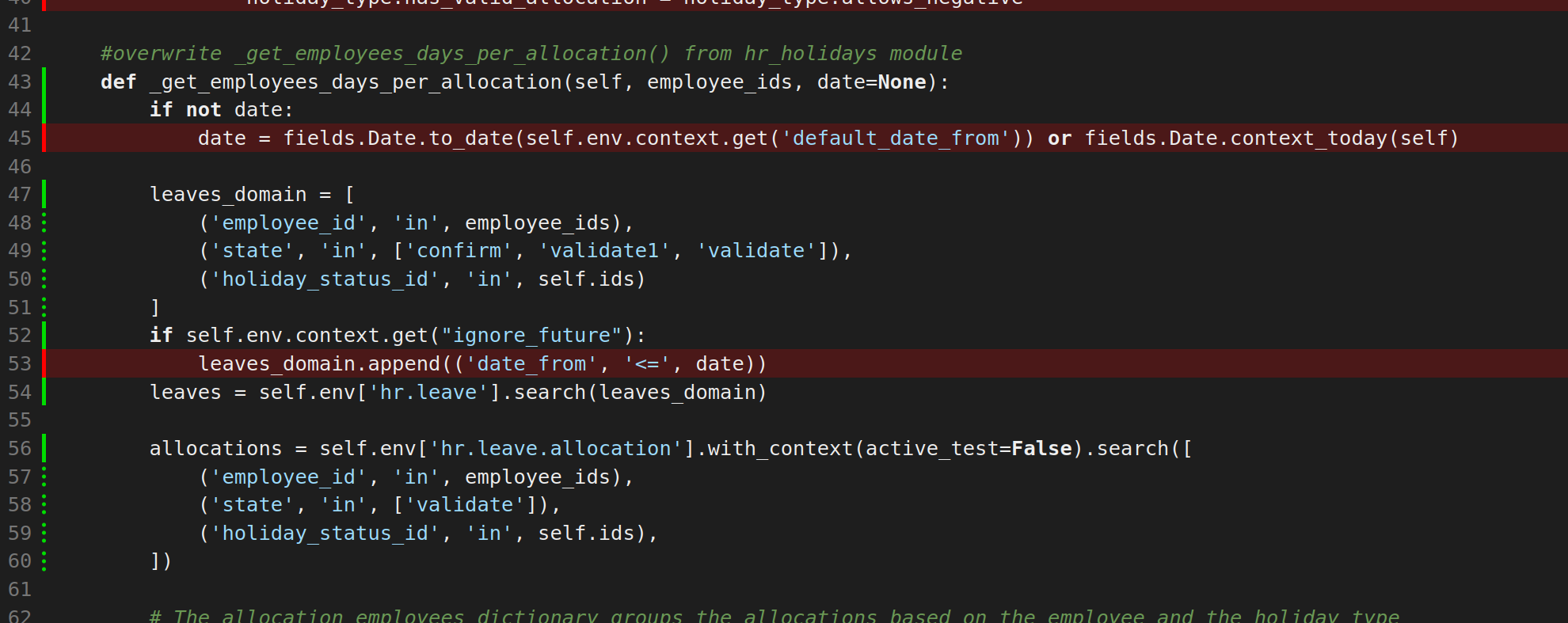 @@ -0,0 +40,4 @@holiday_type.has_valid_allocation = holiday_type.allows_negative#overwrite _get_employees_days_per_allocation() from hr_holidays moduledef _get_employees_days_per_allocation(self, employee_ids, date=None):J'ai du mal à comprendre cette maxi fonction. Je veux bien qu'on voit ça ensemble.